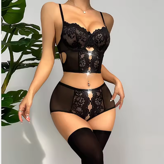Women Lace Mesh Perspective Sexy Lingerie Set Ladies Shaping Bra Set With Stockings