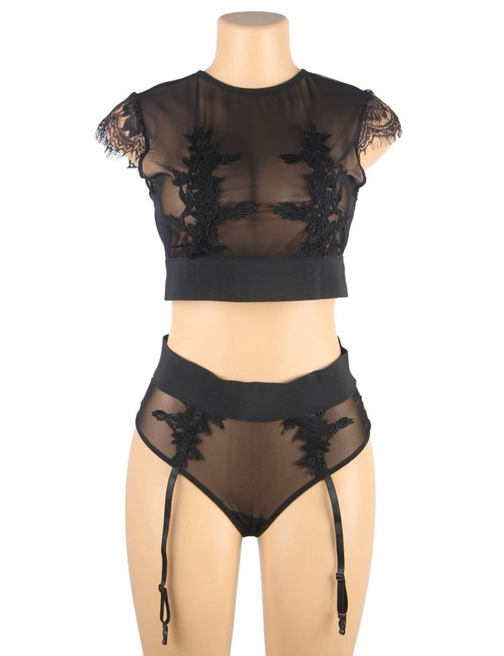 Black High Waist Elegant Embroidery Bra And Garter Panty Set
