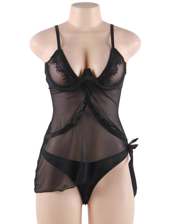 Elegant Black Perspective Lace Backless Sexy Babydoll With Underwire