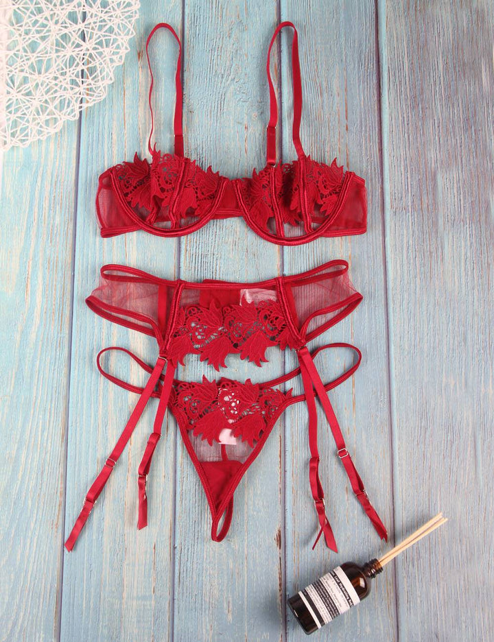 Elegant Embroidery Applique Lace Bra Panty Set With Underwire