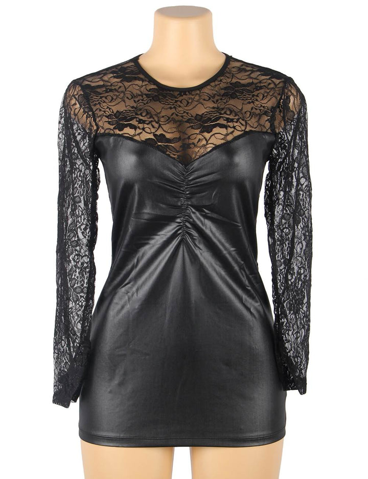 Leather Patchwork Lace Round Neck Front Pleat Long Sleeve Sexy Leather Miniskir
