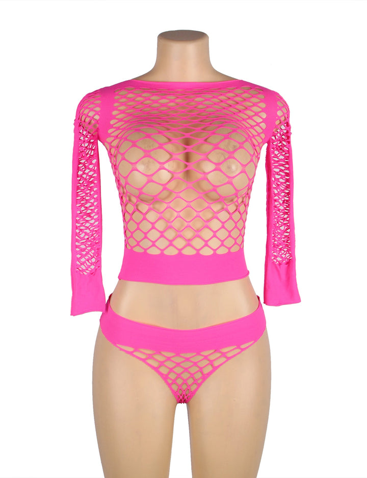 Long Sleeve Two-Piece Bodystocking With Fishnet Crop Top And Bottom (2 Colors)