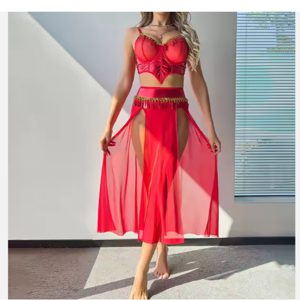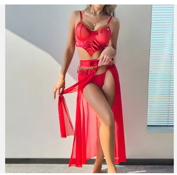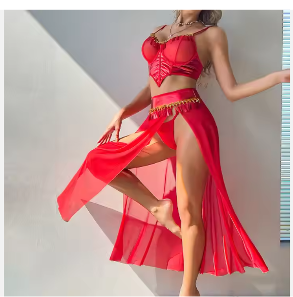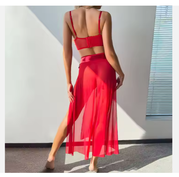 Prom Dress Up Party Women Lingerie Sexy G-String Sets Red High Waist Slit See-Through Skirt & Bra Transparent Three-Piece Set