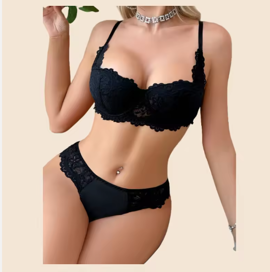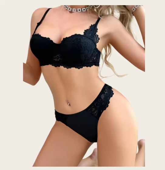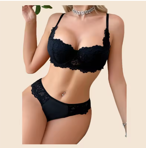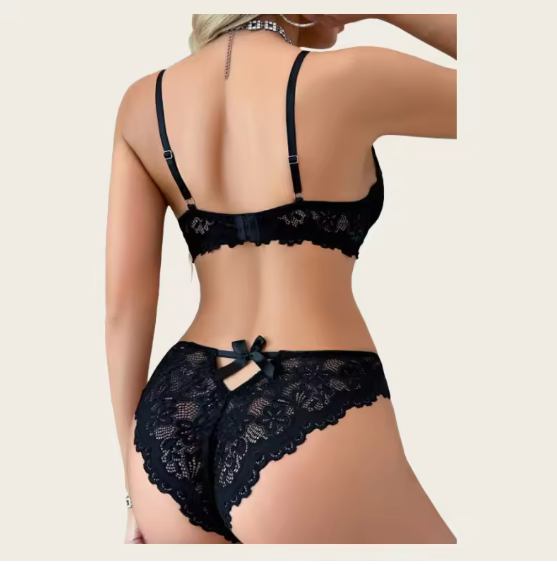Black Flora Underwear Lace Set Comfortable Bra & Panties Hollow See-Through Lingerie Adjustable Two-Piece Set
