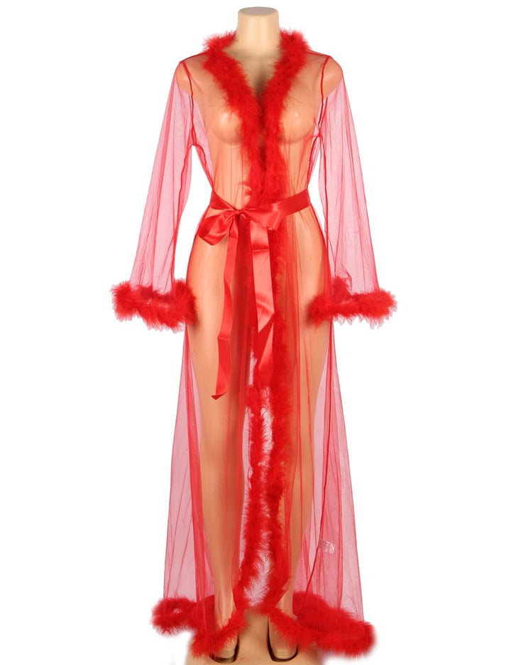 Plus Size Red Nightdress With Belt Plush Edging Mesh Plus Size Robe