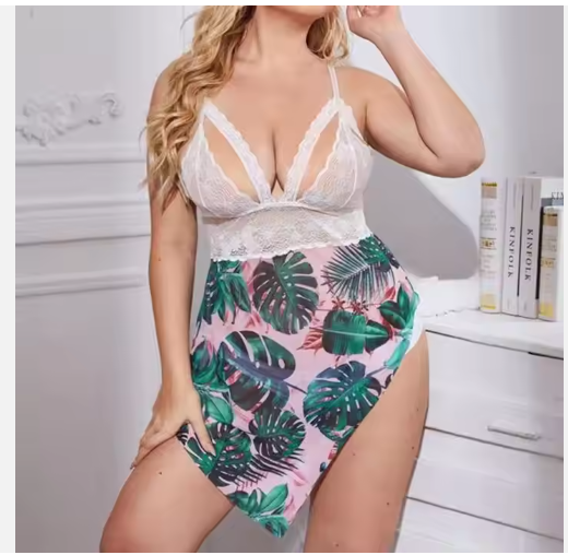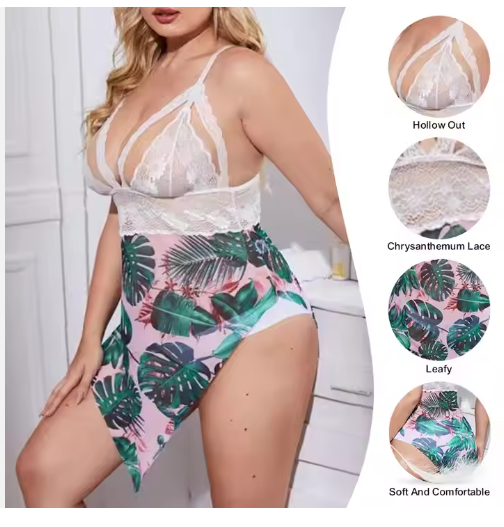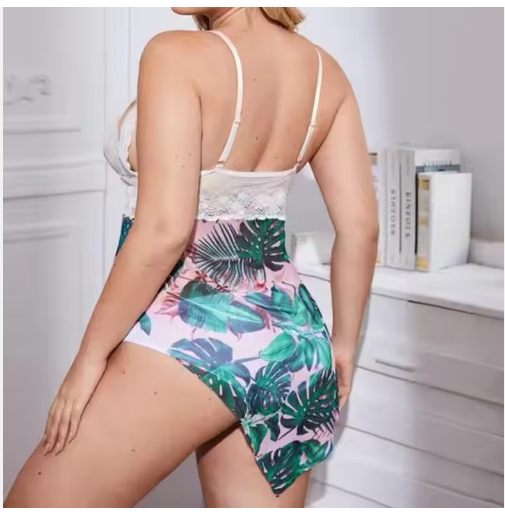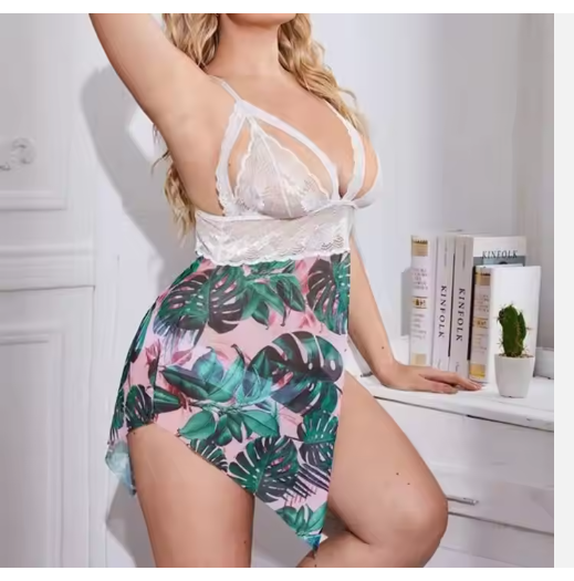 Ladies Lace See-through Sexy Underwear Erotic Printing Pajamas Dress Lingerie Set