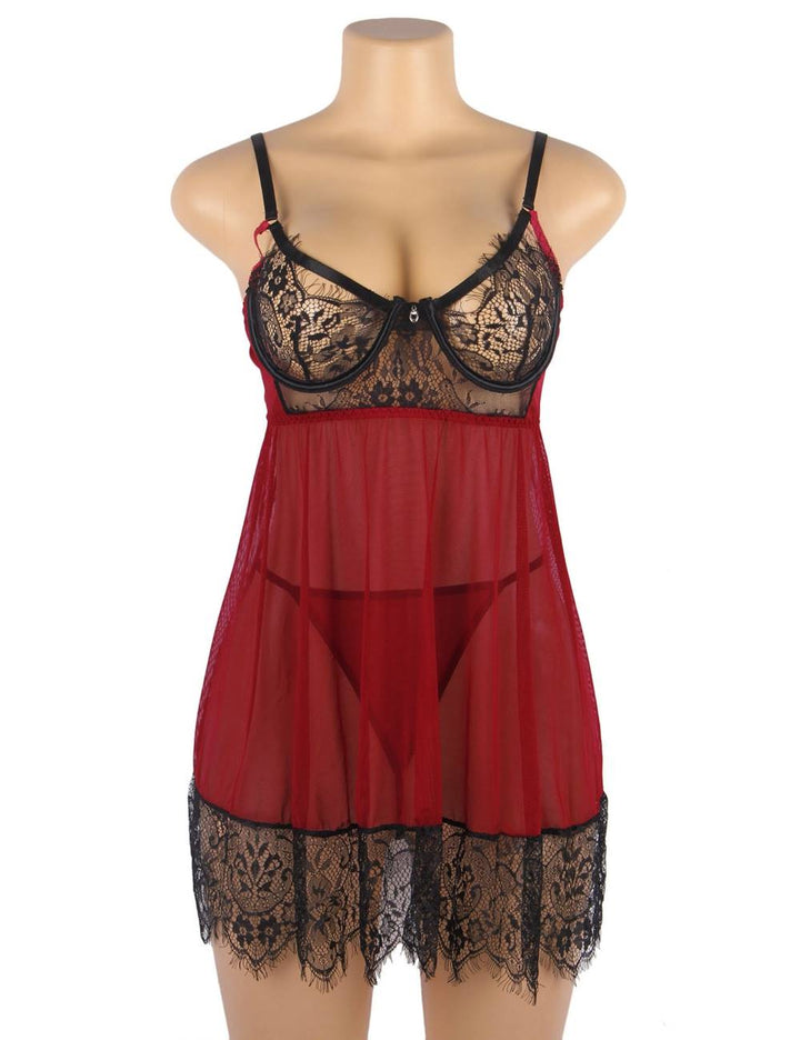 Splicing Sheer Eyelash Trim Lace Back split Babydoll Set With Underwire