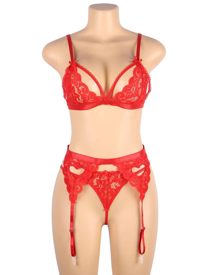 Three-piece sexy lingerie with deep V and peach heart garter (2 Colors)