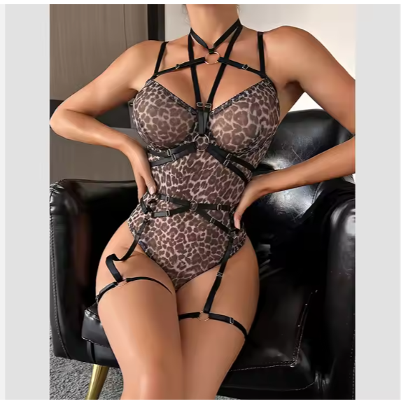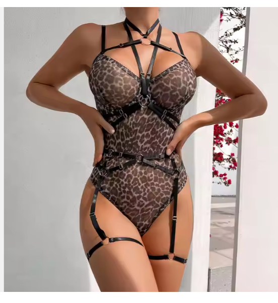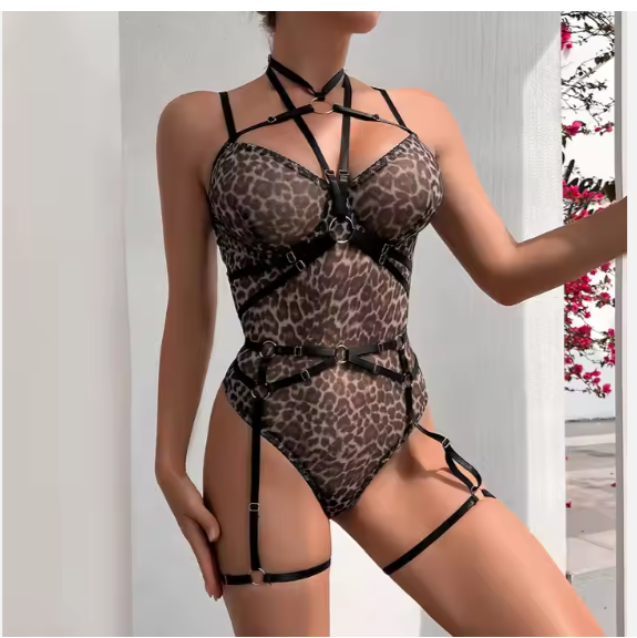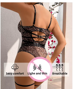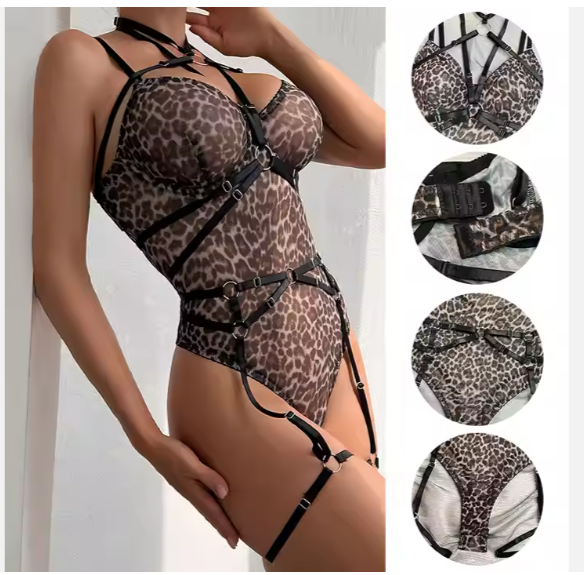 Ladies Sexy Underwear Leopard Print Bandage Lingerie Comfortable Hollow Out Slim Fitting Bodysuit
