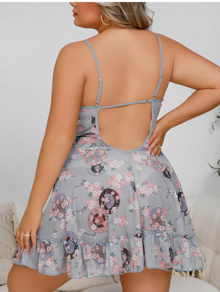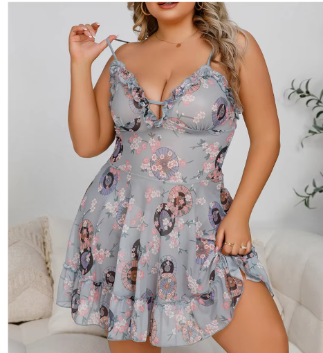 Women Sexy Gray Sleepwear V-Neck Night Dress Ladies See-through Sleeveless Underwear Nightie Lingerie